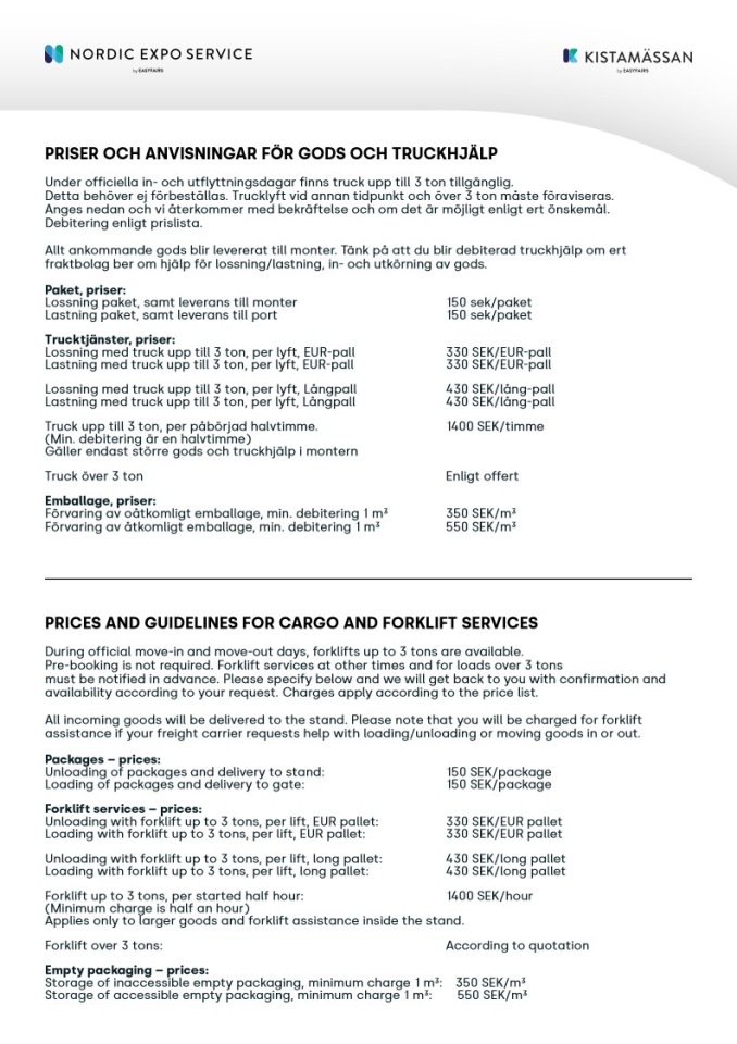 All godshantering sker via Nordic Expo Service. Kostnad för lossning, lastning och hantering av ert ankommande och avgående gods tilkommer enligt Nordic Expo Service tariffer. Se priserna under Gods tariffer