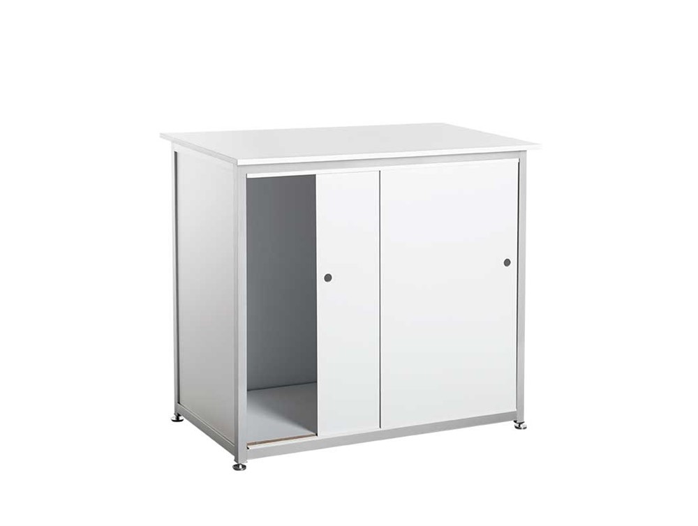 Disk, 1000x500x900mm, vit. Baksida med hyllplan och skjutdörrar, ej låsbara