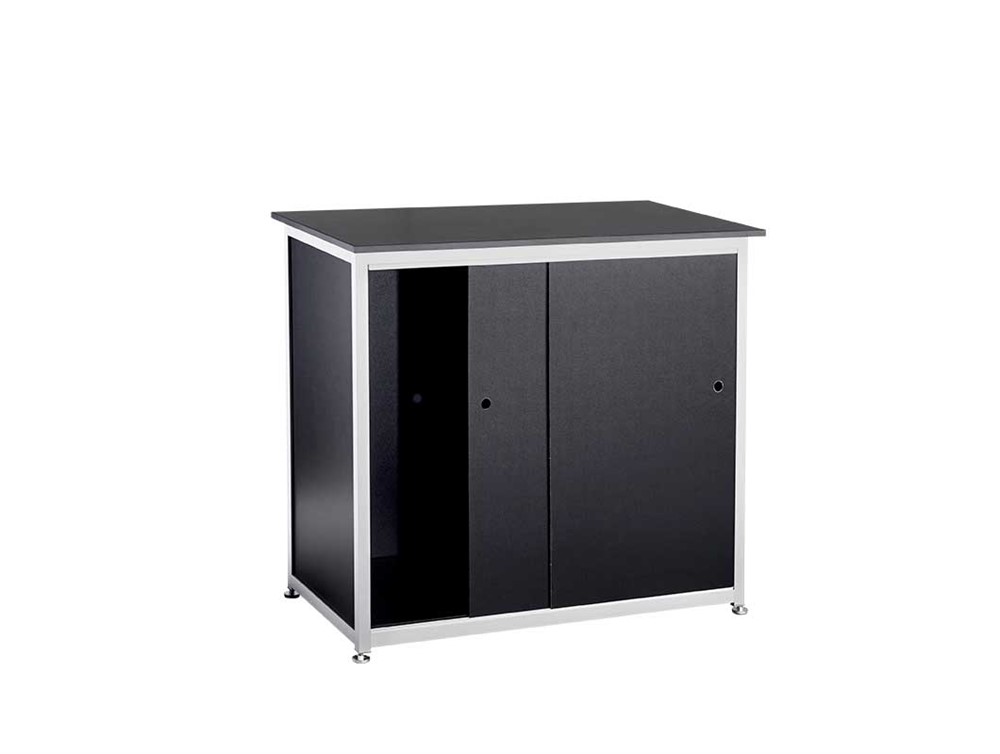 Disk svart, 1000x500x1100mm. Baksida med hylla och skjutdörrar. Ej låsbar.